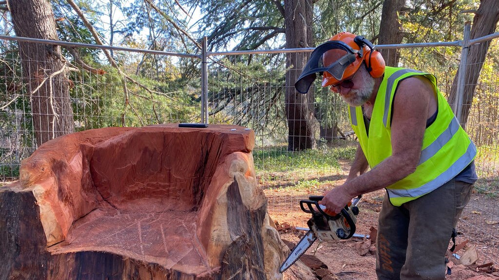 "You walk around the log and ask it what it wants to be, sometimes it talks back," says Kevin Duffy, who is busy carving a "seat of reflection" from an old giant sequoia in the north-east Victorian town of Beechworth.