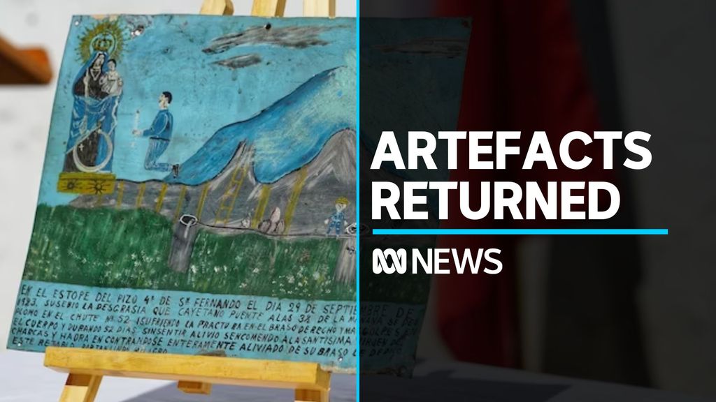 Photo shows Two people hold up a large Aboriginal paintingCultural objects sent back to Mexico after seizure in Australia