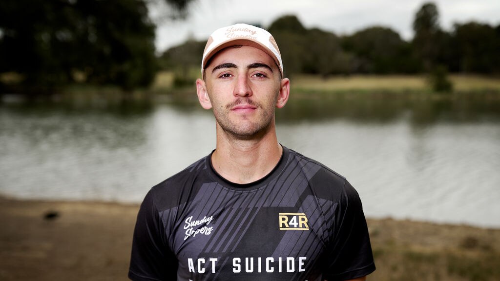 Photo shows A man wearing a white cap and a black shirt with the words"ACT suicide free by 2033".Once bodybuilders, Gold Coast couple breaking world records in their 80s