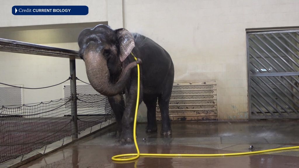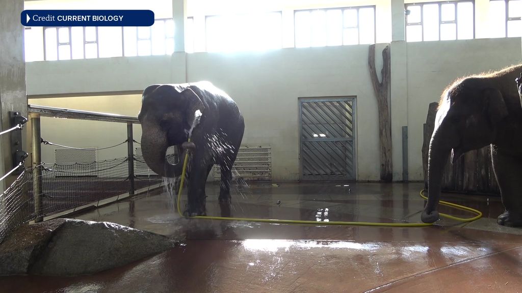 Mary the elephant uses a hose as a tool at the Berlin Zoo.
