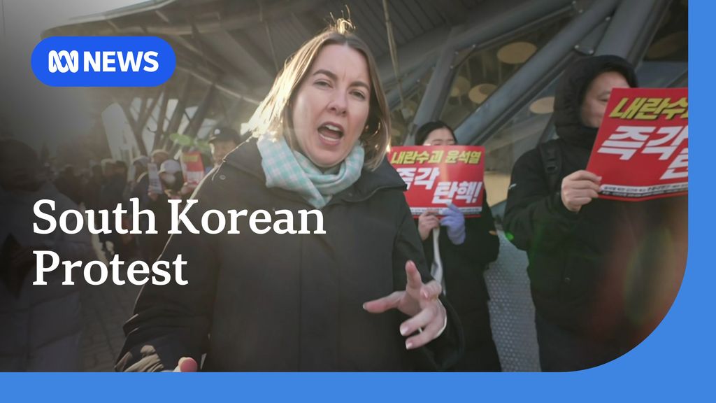 Photo shows Peter Dutton and Anthony Albanese cross paths in the House of Representatives.Protesters gather outside South Korea's National Assembly
