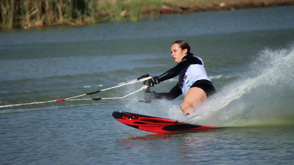 Photo shows Eira Dalzell water skiing on a red water ski in a river, wearing a black long sleeve top and white vest.Epilepsy fails NDIS funding criteria because it's not considered a disability, and families are suffering