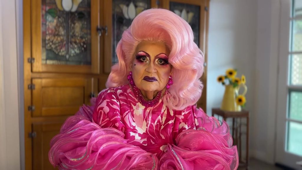 Jean Marie Bennett in full drag, repeating her famous line from The Adventures of Priscilla Queen of the Desert.
